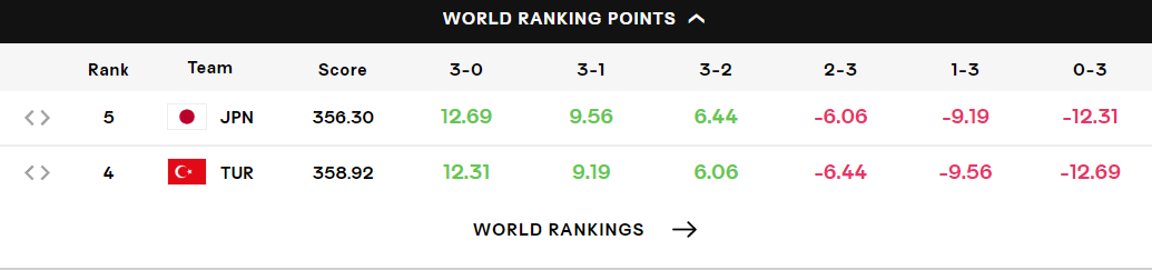 正如我写前瞻时的说法,这场比赛对于日本女排(356.30)来说是冲击世界排名第三的大战,就算是3-2赢球都有+6.44分,日本女排就可以连续超过土耳其女排世界排名第四(358.92),波兰女排世界第三(359.85)成为新的世界第三。相应的土耳其女排只要击败日本队也可以成为新的世界第三。